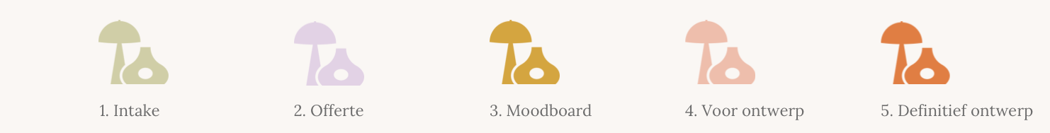 Onze samenwerking begint met een vrijblijvende intake, waarna ik een offerte maak. Hierna begint het creatieve gedeelte; namelijk een moodboard. Hierin breng ik de sfeer en kleuren voor jou in kaart. Vervolgens zet ik het moodboard om in een ontwerp, die we samen gaan bespreken. Hierna is het tijd voor de laatste wijzigingen en aanpassingen en volgt het definitieve ontwerp waar jij mee aan de slag kan!
